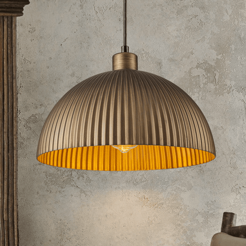 The industrial dome pendant light fixture adds rustic touches to your space, seems contrary to your modern space, but unexpectedly matches your modern decor. Crafted with ribbed textures both inside and outside. Each texture signifies our commitment to exceptional craftsmanship and a pursuit of a refined lifestyle. Designed with an opening, this vintage gold metal pendant hanging light creates a cozy atmosphere, perfect for dining or unwinding in comfort.